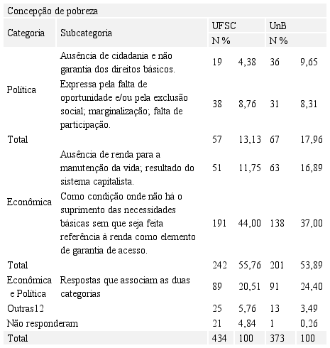 Como podemos verificar na Tabela 3, 13,13% dos 434 cursistas da UFSC, e 17,96% dos 373 da UnB, enfatizaram a dimensão política ao expor a concepção de pobreza, destacando elementos relacionados à “falta de oportunidade, à exclusão social, à marginalização, à falta de participação” (8,76% no caso da UFSC e 8,31% no caso da UnB), à “ausência de cidadania e a não garantia dos direitos básicos” (4,38% e 9,65%), respectivamente. Outro grupo, representando mais da metade, 55,76% no caso da UFSC e 53,89% no caso da UnB, apresentou uma concepção de pobreza cuja ênfase está na dimensão econômica, ou seja, o destaque foi dado à “ausência de renda para a manutenção da vida e ao fato de o fenômeno ser resultado do sistema capitalista”13 (11,75% no caso da UFSC e 16,89% no caso da UnB), e ao “não suprimento das necessidades básicas, neste último caso, sem fazer referência direta à renda como elemento de garantia de acesso aos bens materiais” (44% e 37%), respectivamente. Um terceiro grupo, 20,51% no caso da UFSC e 24,40% no caso da UnB, enfatizou as duas dimensões ao apresentar a concepção de pobreza. Para além desses, 5,76% dos/as cursistas da UFSC e 3,49% dos da UnB responderam de forma ampla e pouco explicativa ou de modo que não permitia entendimento claro. Respectivamente, 4,84% e 0,26% não responderam.