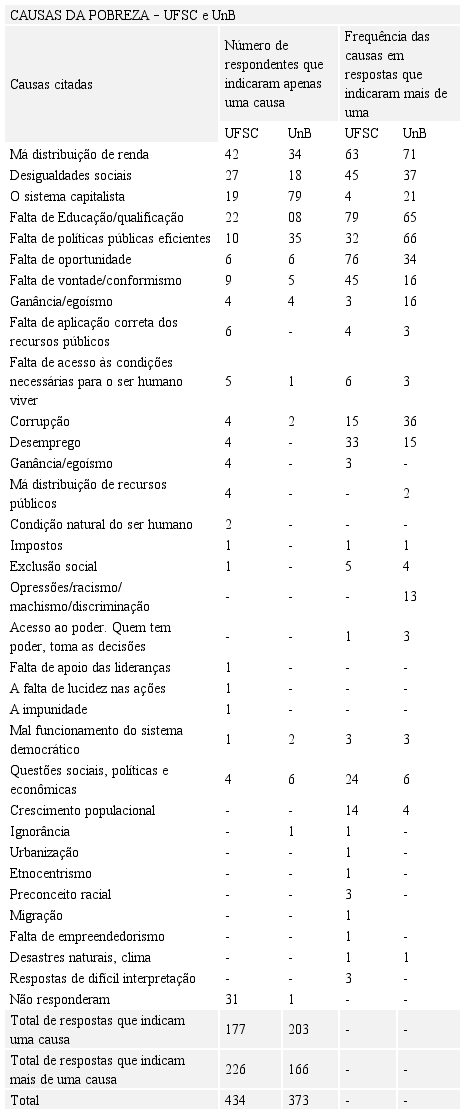 Também é necessário dar relevo aos dados relativos à “falta de políticas públicas eficientes” como causa da pobreza, destacada principalmente por cursistas da UnB, visto que esta ficou em segundo lugar no caso dessa universidade, com 101 registros, sendo 35 como causa única. Isso pode ter favorecido uma menor citação da “educação/qualificação” como causa, visto representarem políticas públicas, estando, portanto, incluídas nessa causa. No caso da UFSC, essa causa ficou em oitavo lugar, com 42 referências, sendo dez como causa única.