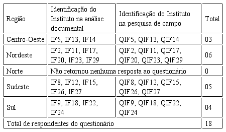 O Quadro 1 apresenta o quantitativo de respondentes aos questionários e a identificação categorizada dos Campi dos Institutos Federais e as respectivas regiões.