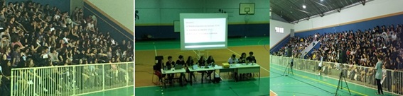 No Instituto Federal de Santa Catarina (REGISTRO 01), os estudantes reunidos em assembleia, consideraram essencial estabelecer um diálogo claro e objetivo com a sociedade. Se em 2016, parte daqueles estudantes haviam deliberado por ocupar a instituição de ensino em protesto às medidas autoritárias do poder executivo federal6, a conjuntura atual exigia colocar a escola na rua: “enquanto o bloqueio orçamentário não for resolvido, uma vez por semana, vamos caminhar até a escadaria da Catedral Metropolitana de Florianópolis e vamos oferecer a população, uma aula pública”.Este foi o principal consenso estabelecido entre os estudantes que lotavam o Ginásio de Esportes.