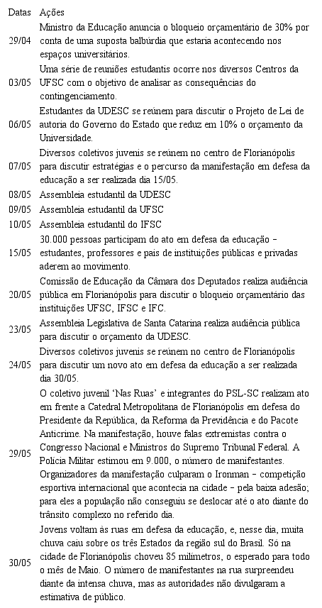Na cidade de Florianópolis, o anúncio do bloqueio orçamentário nas três instituições de ensino federal – UFSC, IFSC e IFC – ocorre concomitante ao envio de um Projeto de Lei de autoria do Governo Estadual à Assembleia Legislativa, que pretende reduzir em 10% o repasse de recursos via duodécimo à Universidade do Estado de Santa Catarina5. Tais fatos colocaram em curso uma série de atos protagonizados por jovens, na tentativa de mostrar à sociedade a ‘verdadeira balbúrdia’ que era produzida nestas instituições – produção científica e tecnológica de vanguarda, ações extensionistas em comunidades vulneráveis, além das atividades de ensino reconhecidas internacionalmente por sua qualidade.