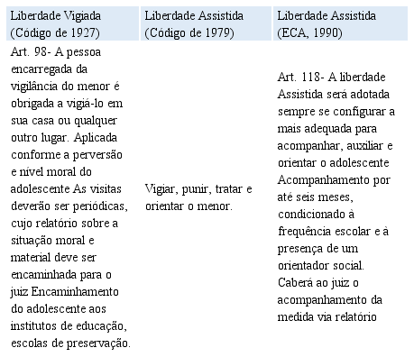 O quadro anterior exemplifica o que Silva (2005/2010) chama de continuidades e descontinuidades do ECA. Ou seja, observando-se a aplicação da Liberdade Assistida, verifica-se a existência de elementos e terminologias utilizadas na Doutrina Menorista e que ainda são aplicadas pela Doutrina de Proteção Integral. Contudo, é reconhecido que o ECA, apesar de lidar com inúmeros desafios na sua efetivação, é um modelo que tem o propósito claro de romper com as políticas públicas que criminalizam a pobreza. Por outro lado, o ponto mais difícil da legislação que tem sido constantemente questionado refere-se justamente às medidas socioeducativas.