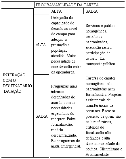 A quarta, ‘baixa programabilidade e reduzida interação com os destinatários’, refere-se aos projetos com benefícios de complexidade relativamente baixa em face de problemas evitáveis e cujas tarefas, apesar de homogêneas, não são padronizadas ou formalizadas. Este é o caso típico de alguns projetos de assistência que transferem recursos que são manuseados com escassa precisão em relação aos beneficiários, critérios de segmentação não definidos e com elevada discrição política na sua gestão (NOGUEIRA, 1998).
