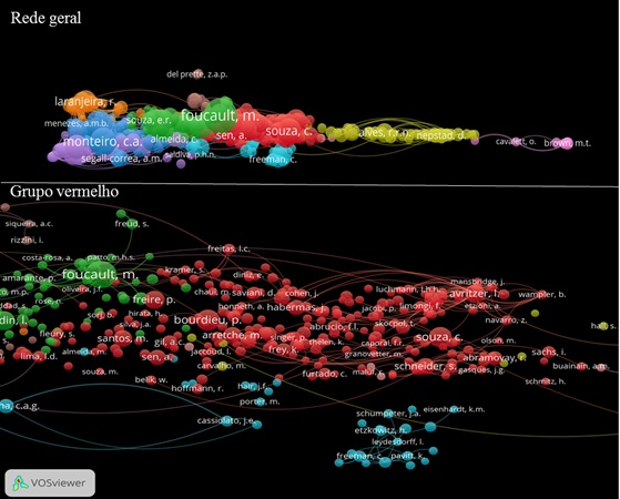A Figura 7 mostra a rede bibliométrica formada pela análise de cocitação; nessa parte avaliou-se qual o grupo de autores são citados juntos. Os itens (769 autores) que compõem a rede foram selecionados com base: no número de citação, mínimo 30; e associação com outros autores, pelo menos uma conexão. A parte superior da Figura mostra a rede geral formada, e a inferior uma visualização aproximada do grupo vermelho. De forma geral, quanto mais próximo um autor estiver do outro, maior a chance de serem citados juntos independentemente do grupo no qual se encontram. Observa-se um total de oito grupos, cada um identificado por uma cor; autores de um mesmo grupo têm uma probabilidade maior de serem citados em conjunto. Por exemplo, no grupo vermelho, quem citou Sousa também citou Avritzer, Arretche e Frey. Os autores desses clusters discutem, possivelmente, temas de pesquisa específicos dentro do contexto das políticas públicas; isso fica nítido nos grupos mais isolados com poucas conexões com outros grupos.