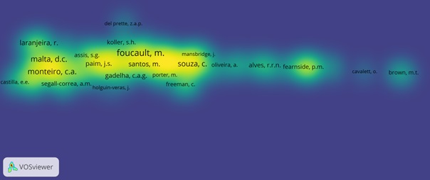 A Figura 8 também mostra a análise de cocitação, porém foi construído com base na densidade dos itens, áreas mais densas indicam a concentração das citações. Os autores que se destacaram por serem citados com outros pesquisadores foram: Laranjeira; Malta; Monteiro; Focault; e Souza. Outro ponto foram os grupos isolados que corroboram com a ideia de temas de pesquisa específicos.