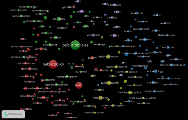 No que diz respeito ao Brasil, foi observado que a sua rede colaborativa com outros países mostrou um grande intercâmbio com várias nações do mundo, contudo, apresentou maior combinação de coautoria com Portugal, Espanha e França. Em relação às colaborações entre as instituições destacam-se a USP, UFRJ e UFMG, UFV e UFRGS. Na análise de cocitação, autores que são citados juntos, foi possível identificar 769 pesquisadores que tiveram no mínimo 30 citações e, pelo menos, uma conexão com outros autores. Observou-se um total de oito grupos, autores de um mesmo grupamento têm uma probabilidade maior de serem citados em conjunto. Por fim, na avaliação de copalavra foram analisadas a frequência e as conexões de palavras-chave dos artigos; notou-se que cada grupo de palavras abordava temáticas diferentes, além disso, podem-se perceber as lacunas de pesquisa do tema políticas públicas. Por exemplo, houve pouca interação entre as palavras desenvolvimento regional e desigualdade na saúde.