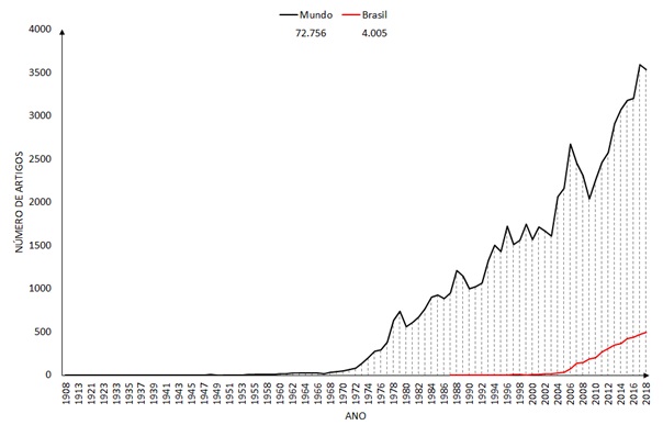 Em um panorama global, a primeira publicação sobre políticas públicas no mundo ocorreu em 1909, enquanto, no Brasil, em 1987 (Figura 1). Em ambos os contextos, há um período em que o tema não era muito discutido pela comunidade acadêmica; no mundo, esse período foi de 1909 a 1969 e, no Brasil, de 1987 a 2004. Após essa lacuna temporal, observou-se uma tendência de crescimento sobre o tema.