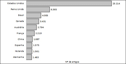 A Figura 2 mostra os dez países que mais publicaram sobre o tema políticas públicas. Destaca-se os Estados Unidos com 25.099 trabalhos ao longo dos anos, seguidos pelo Reino Unido, Brasil, Canadá, Austrália e França, com mais de duas mil publicações. É interessante notar que o Brasil apareceu em terceiro lugar, apesar de iniciar o debate sobre o tema somente em 1987.