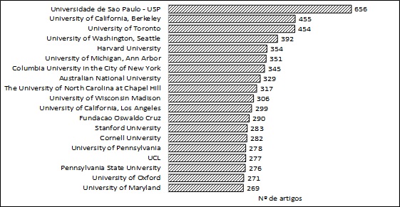 A Figura 3 mostra as 20 instituições que mais publicaram sobre o tema pesquisado. A Universidade de São Paulo (USP) foi a organização que mais produziu artigos científicos no mundo. Destaca-se, também, outra organização brasileira, a Fundação Oswaldo Cruz, que apareceu em décimo segundo lugar. Em contraponto, Estados Unidos ganha em número de trabalhos (Fig. 2), todavia suas publicações são divididas e balanceadas entre as instituições do país.