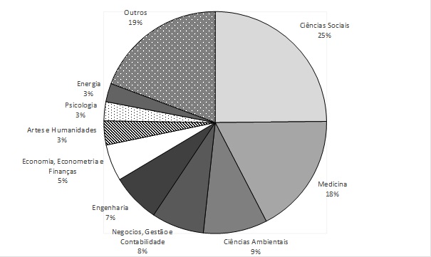 Na Figura 4, se visualizam as diferentes subáreas do tema políticas públicas. Se observa que os campos das Ciências Sociais (25%) e da Medicina (18%) concentram 43% dos trabalhos sobre políticas públicas, seguidos por outros setores menos expressivos. Vale ressaltar que foram encontradas 28 áreas de conhecimento no todo, porém não foram tão expressivas quanto as destacadas na Figura.
