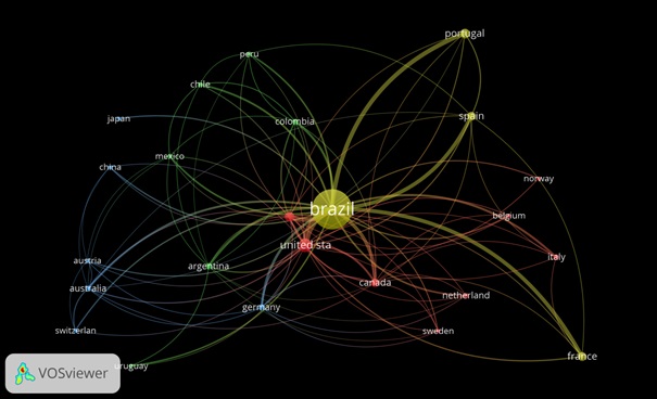 A Figura 5 mostra a rede de colaboração dos países quanto ao tema estudado, e foram selecionadas as nações que possuem no mínimo 5 publicações em coautoria com o Brasil, o que totalizou 24 nações. Tendo como nó central o Brasil, foi possível observar suas conexões com os demais países. Destaca-se uma relação forte - indicado pela proximidade dos itens, quanto maior o número de coautores maior será a similaridade - entre Estados Unidos e Reino Unido com o Brasil; por outro lado, essa relação foi pouco articulada com outros países. Ao observar os grupos formados fica clara a articulação brasileira com Portugal, Espanha e França. A formação desses grupos significa que os países têm uma maior sinergia, ou seja, os trabalhos publicados apresentaram uma combinação dos países de seu respectivo agrupamento com uma maior frequência.