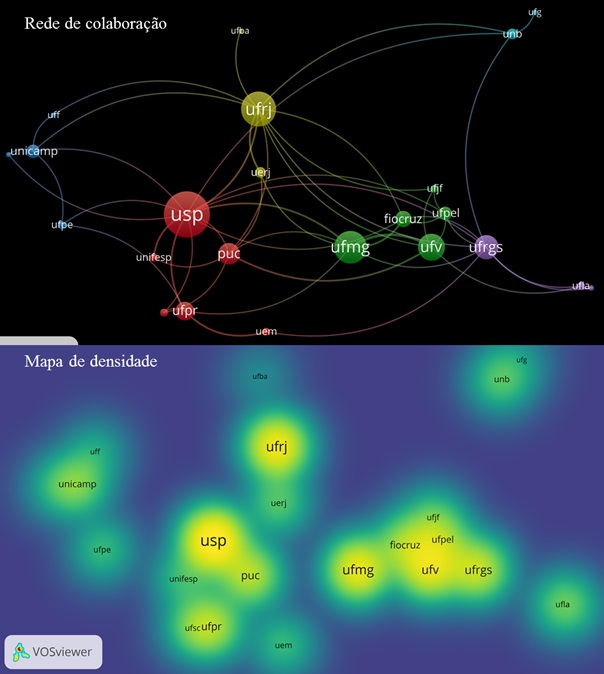 A Figura 6 mostra a rede de colaboração e o mapa de densidade das instituições de ensino; foram selecionadas aquelas com mais de 5 artigos que apresentaram coautoria com outras organizações, o que resultou em 25 instituições. Na parte superior da Figura, foi possível observar a estrutura de participação das organizações, seis grupos foram formados: cluster 1 (azul escuro), composto por UFF, UFPE, UFSCar e Unicamp; cluster 2 (vermelho), formado pela PUC, UEM, UFPR, UFSC, UNIFESP e USP; cluster 3 (amarelo), composto por UERJ, UFBA e UFRJ; cluster 4 (verde), constituído por FIOCRUZ, UFJF, UFMG, UFPel e UFV; cluster 5 (lilás) estabelecido pela UFLA, UFRGS, UFRN; cluster 6 (azul claro) formado pela UFG e UNB. Nota-se uma predominância de instituições das regiões Sul e Sudeste, o que, possivelmente, indica uma articulação maior das organizações dessas regiões quando comparada com as demais. Também se observa uma participação de organizações das regiões Nordeste e Centro-Oeste e nenhuma participação do Norte. Sobre outra perspectiva, a parte inferior da Figura, mapa de densidade, mostra onde estão concentradas as colaborações. Percebem-se alguns pontos com maior adensamento; esses estão diretamente correlacionados à coautoria entre as instituições e o número de itens no entorno. Nesse mapa de calor se destacam a USP, UFRJ e UFMG, UFV e UFRGS. De forma geral, na Figura 6, é importante ressaltar que essa rede é construída com base nas coautorias, e não na quantidade absoluta de artigos.