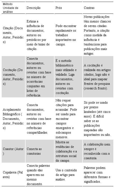 Segundo Zubic e Carter (2015), os cinco principais métodos de mapeamentos bibliométricos são: Análise de citação, cocitação, acoplamento bibliográfico, coautoria e copalavras. Os três primeiros usam medidas de influência e similaridade construídas com base nos dados de citações. O penúltimo mede a colaboração por meio dos dados de coautoria e o último busca conexões entre palavras encontradas nos títulos, palavras-chave ou resumos dos documentos. A Tabela 1 mostra o resumo desses métodos.