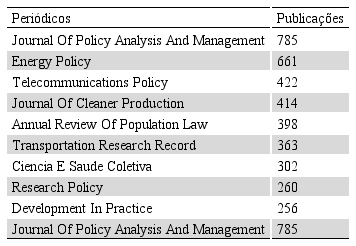 Os principais veículos de comunicação (periódicos) do tema estudado estão apresentados na Tabela 2. No total, foram encontrados 157 periódicos, sendo listados os dez primeiros. Pode-se observar um periódico brasileiro, Ciência e Saúde Coletiva, inserido no panorama mundial.