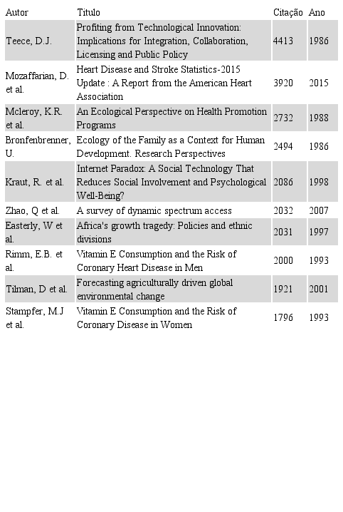 Na Tabela 3 são exibidos os 10 trabalhos mais citados. Os artigos que tiveram o maior número de citações foram: Teece (1986), com 4.413, seguido por Mozaffarian et al. (2015) com 3.920; os outros tiveram por volta de 1.700 a 2.732 citações. De forma geral, foi possível notar uma predominancia das áreas de Ciências Sociais e Medicina.