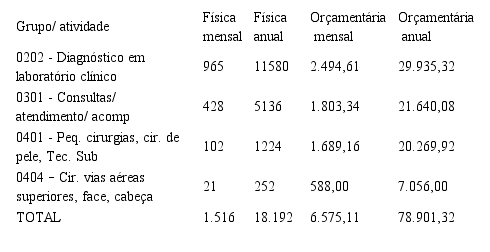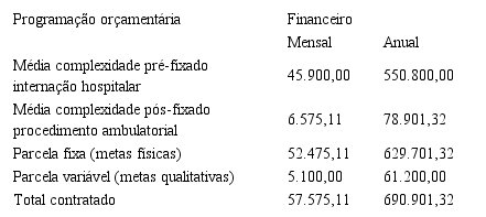 As metas físicas e orçamentárias ambulatoriais estão inseridas num bloco cujos recursos são pós-fixados, ou seja, seus recursos seriam repassados de acordo com a produção mensal necessária e aprovada no Sistema de Informação Ambulatorial do SUS, até o limite do contrato, exposto no quadro 04. A seguir, esses indicadores e metas.