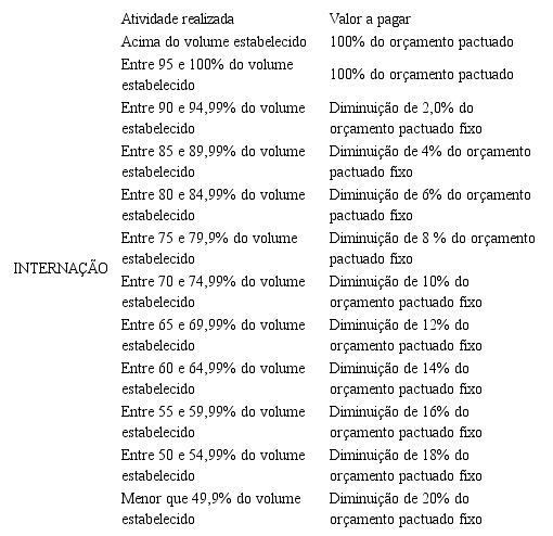 Foi estabelecido que cumprimentos inferiores a esse percentual implicariam o repasse reduzido proporcionalmente à faixa estabelecida no contrato, cuja redução varia de 2% a 20%. Entretanto, o cumprimento de metas físicas ajustadas inferior a 70% por 3 (três) meses consecutivos ou 5 (cinco) alternados implica a reversão automática do pagamento para pós-fixado, ou seja, por produção. Para subsidiar a avaliação da política pública construiu-se um elenco de indicadores e metas quantitativas para a dimensão internação conforme tabela abaixo.