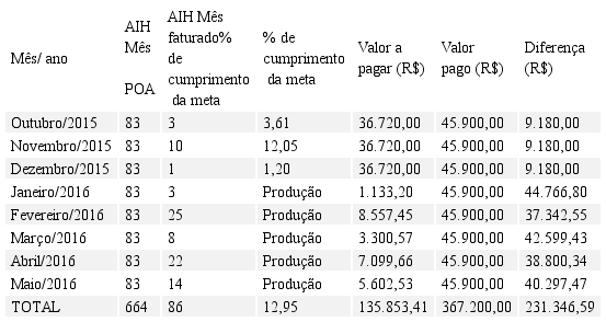 Conforme a tabela acima, podemos observar que a meta de alcance das AIH foi 12,95%, ou seja, menor que 15% do pactuado. De acordo com a regra contratual, no quarto mês o repasse de recursos deveria ter sido revertido de pré-fixado para pós-fixado, ou seja, por produção, em decorrência do cumprimento inferior a 70% das metas pactuadas por três meses consecutivos. Contudo, observou-se o repasse integral.