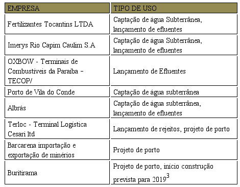 Esse modo de vida, a forma de existir, entrou em conflito com as empresas capitalistas vinculadas a beneficiamento de minério, agronegócio e logística para exportação que disputam a água do rio Dendê. Desde os anos 1990 grandes transformações ocorreram com o hidroterritório do Dendê Identificaram-se, a partir das visitas de campo, outorgas de uso da água disponibilizadas pela Secretaria de Estado de Meio Ambiente e Sustentabilidade do Pará - SEMAS (2018), atas do Codec e denúncias ao MPF algumas empresas que possuem localização próxima ao rio e seu tipo de uso da água, conforme Quadro 1.