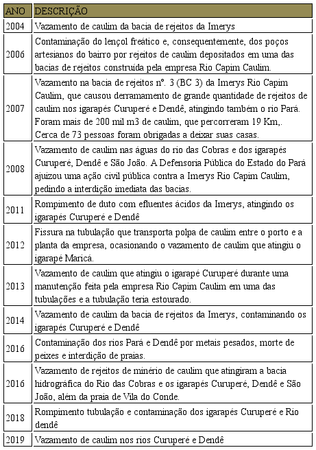 Fora do lançamento constante de efluentes, o hidroterritório do Dendê tem sofrido a ocorrência de vários desastres4 socioambientais, a maioria ocasionada pela empresa multinacional francesa Imerys, listados no quadro 2: