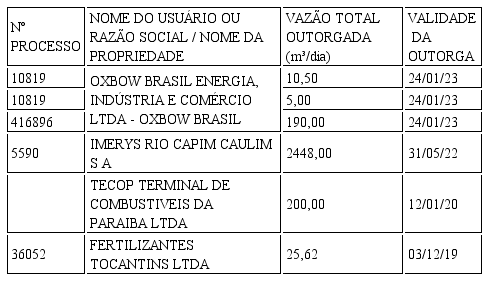 Segundo o site da SEMAS (2019), em relação aos processos de outorga., 159 outorgas foram emitidas a empresas em Barcarena de 2007 a 2018, e somente 27 indeferidas. Especificamente as empresas TECOP/OXBOW, Imerys e Fertilizantes Tocantins, as mais citadas no “hidroconflito” do Dendê, têm, conforme quadro 3, seu direito de uso (gratuito) da água garantido e legalizado.