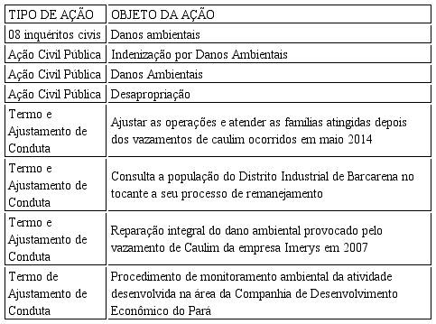 Ministério Público do Estado do Pará (2019) e Ministério Público Federal (2019)/ elaborado pelos autoresAs ações dos Ministérios Públicos tratam de processos de danos ambientais, desapropriação e povos tradicionais, mas tem gerado efeitos contraditórios. As empresas têm continuado suas atividades (poluentes), mesmo com algumas adaptações, respaldadas pelas negociações permanentes em torno dos acordos, porém, sem implementar as ações acordadas e permitindo a continuidade da acumulação por espoliação, conforme uma breve análise mostrada por dois TACs.
