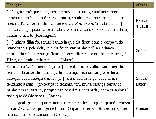 Embora haja um rio cercando a comunidade, existe um cerceamento do uso e das práticas desenvolvidas em torno do rio, a partir deste padrão sociogeográfico dominante, destruindo as bases de outro padrão sociogeográfico (Porto-Gonçalves, 2017). Falas de moradores evidenciam aspectos da vida da comunidade que têm sido afetados pelos conflitos em torno do uso da água.