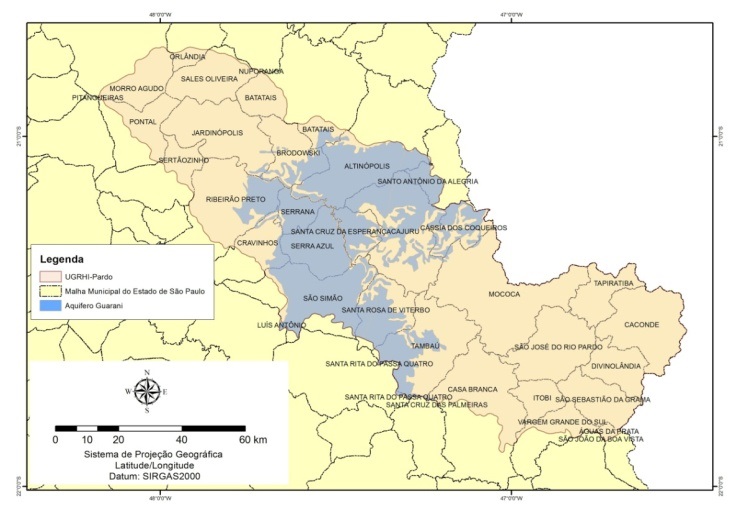 A Bacia Hidrográfica do Pardo – UGRHI 04 - integra 27 municípios, dos quais 50% são abastecidos pelo Aquífero Guarani. Uma área significativa da Bacia corresponde a áreas de recarga do aquífero, presente em 14 municípios (CAMPANHÃO; FONTES; SOUZA; 2014; CPTI, 2008a), conforme mostra a Figura 2. Dentre os municípios que estão na área de afloramento do SAG destacam-se Altinópolis, Santo Antônio da Alegria, Serrana, Serra Azul, Santa Cruz da Esperança, Cássia dos Coqueiros, São Simão. Estes municípios possuem 100% do seu território na área de afloramento e são considerados de pequeno porte, ou seja, possuem população inferior a 50 mil habitantes (SÃO PAULO, 2011).