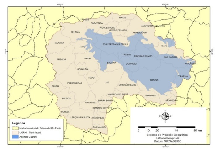 Bacia Hidrográfica do Tietê/Jacaré, UGHRI 13, é composta por 34 municípios localizados na região central do estado de São Paulo e que estão relacionados, principalmente, à agroindústria, além de outros setores industriais (CPTI, 2008b). A área de afloramento do SAG corresponde a 39,70% da área total da UGRHI-13 (SÃO PAULO, 2011), conforme Figura 3, sendo, portanto, uma área significativa que merece atenção e cuidado por parte da comunidade em geral e, especialmente, dos gestores públicos.