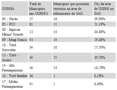 A porcentagem do território das UGRHIs que são ocupadas pela área de afloramento é desigual. A UGRHI 04 - Pardo e a UGRHI 13 - Tietê - Jacaré são as que possuem maior extensão territorial ocupada pela área de afloramento, (SÃO PAULO, 2011) conforme apresenta a tabela 1. As UGRHIs 04 e 13 também possuem, em relação às outras UGRHIs, a maior porcentagem de municípios que tem seu território inserido na área de afloramento.