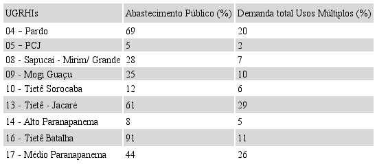 Com relação à demanda total de águas subterrâneas que considera também os usos agrícolas e industriais, estas duas UGRHIs também possuem a maior demanda em relação a todas as outras da área de afloramento (DAEE, 2005). A tabela 2 apresenta a relação de dependência das UGRHIs da área de afloramento conforme os indicadores utilizados pelo DAEE (2005).