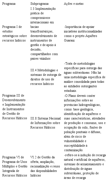 As águas subterrâneas são também tratadas nos programas e subprogramas do Plano Nacional, conforme apresentado no Quadro 1.