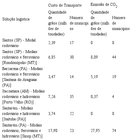 Em uma análise comparativa entre as soluções logísticas listadas, nota-se que seis estão relacionadas à minimização dos custos de transporte nos municípios mato-grossenses. Tais soluções de transporte são: (solução i) transporte rodoviário direto até o Porto de Santos; (ii) transporte até o Porto de Santos com a utilização do terminal ferroviário de Rondonópolis; (viii) transporte para o porto de Itacoatiara a partir da utilização do terminal hidroviário de Porto Velho; (xii) transporte até o Porto de Santarém a partir da utilização do terminal hidroviário de Itaituba; (xiv) transporte até o Porto de Santarém com a utilização infraestrutura pretendida pelo projeto da Ferrogrão; e (xv) transporte até o Porto de Barcarena com a utilização da infraestrutura pretendida pelo projeto da Ferrovia Paraense. Tem-se, portanto a utilização de um total de quatro portos – Santos (SP), Itacoatiara (AM), Santarém (PA) e Barcarena (PA).