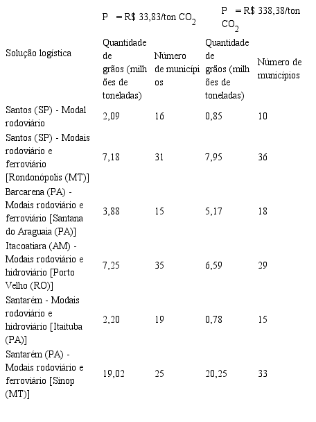 Ao considerar a precificação das emissões de CO2 da operação de transporte uma realidade aos exportadores de grãos, conforme indicativo acima apresentado, alterações passam a ser verificadas na competitividade e área de influência das soluções de transporte. Ao considerar a cobrança de R$ 33,83 (equivalente a US$ 10,00) por tonelada de CO2. emitida no transporte de grãos, reduções no volume potencial de movimentação são observadas nas soluções logísticas i e xii em comparação com o primeiro cenário discutido.