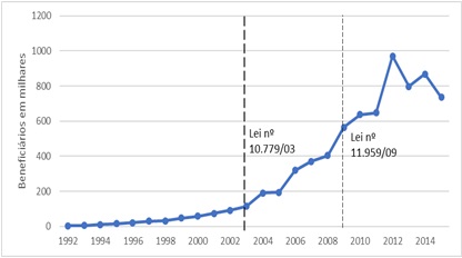 Dessa maneira, analisando os dados constantes em Brasil (2017), nos primeiros anos do programa (1991-1992), o número de beneficiários do Seguro-Defeso foi pequeno se comparado ao total de pescadores do país, tendo ocorrido, no entanto, um crescimento exponencial, principalmente ao longo da primeira década dos anos 2000. De acordo com os dados utilizados no referido trabalho, os valores foram de 2,7 mil em 1992, para 29,1 mil em 1997 e 92 mil em 2002. De 2003 em diante, regidos pela Lei nº 10.779, os beneficiários foram de 113 para mais de 500 mil em 2009. Após a promulgação da Lei nº 11.959/09, o crescimento no número de beneficiários se mostrou contínuo até 2012, indo de aproximadamente 550 mil para quase 970 mil em 2012, terminando em 2015 com cerca de 736 mil (BRASIL, 2017) (Gráfico 1). É impossível implicar causalidade nesse fenômeno, contudo, as reduções das exigências para aptidão ao benefício e a nova definição expandida de pesca artesanal, amparados pelo ideário desenvolvimentista dos governos petistas, demonstram ser elementos importantes para o aumento do volume de beneficiários.