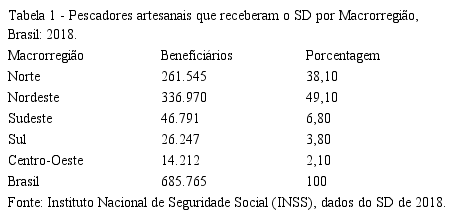 Analisando os dados do pagamento do SD no ano de 2018, o total de beneficiários registrados na base do Instituto Nacional de Seguridade Social (INSS) que o receberam foi de 685.765 pescadores, número significativamente menor que em anos anteriores (DIAS NETO, 2017). Os pescadores artesanais beneficiados em 2018 estavam concentrados nas regiões Norte e Nordeste do país, representando respectivamente 38% e 49% do total de beneficiários do programa. O Sudeste, Sul e Centro-Oeste tiveram, respectivamente, apenas 6,8%, 3,8% e 2% do total (Tabela 1).
