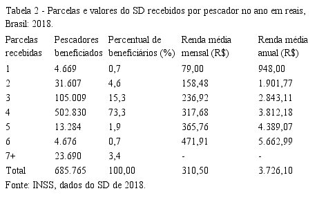 Em relação ao montante aferido pelos pescadores, o valor médio de cada parcela paga foi de R$950, enquanto a média de parcelas recebidas foi de quatro (4) por pescador, número de parcelas que foi recebido por mais de 73% dos favorecidos pelo SD. Dessa maneira, o valor médio recebido pelos pescadores no ano girou em torno de R$3.726,10, valor que, se dividido pelos meses do ano, daria uma renda média mensal de R$310,50 (Tabela 2).