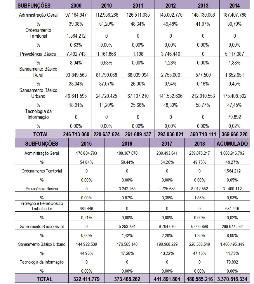 Ao analisar as subfunções onde são realizados os gastos, nota-se a preponderância de gastos de natureza administrativa com 49% do total, e dos gastos com Saneamento Urbano que tiveram uma participação de 41,7% no período. Os gastos com Saneamento Rural atingiram a marca de apenas 8% no período.
