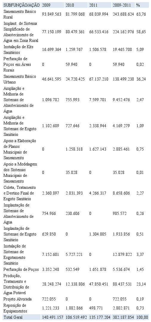 Conforme já esboçado, os gastos efetuados no período de 2009 a 2011 se deram preponderantemente em ações de Saneamento Básico Rural, importando em 64% dos gastos finalísticos efetuados neste período. Nota-se que a principal ação executada foi a Implantação de Sistema Simplificado de Abastecimento de Água em Zona Rural que correspondeu a aproximadamente 60% dos gastos efetuados em saneamento do período. Assim, pode-se afirmar que atuação do poder público neste período teve como prioridade resolver problemas ligados ao abastecimento de água na zona rural do Estado.