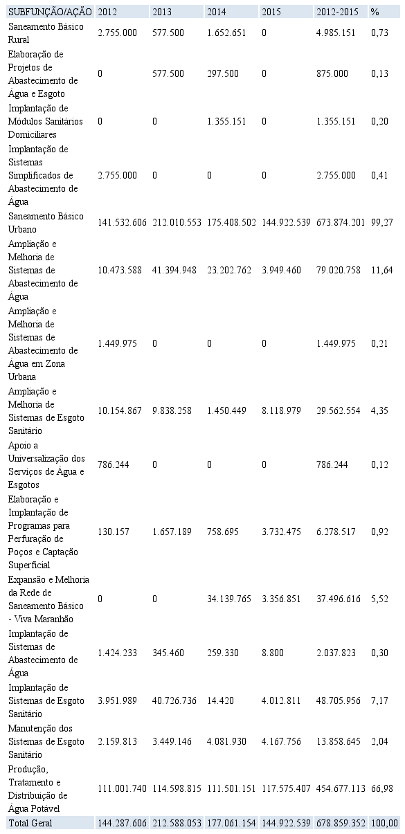 Conforme já apontado anteriormente, no período de 2012 a 2015 observa-se uma queda brutal nos gastos com Saneamento Básico Rural. Em contraposição ao período anterior, nota-se que quase todos os recursos foram aplicados no Saneamento Básico Urbano (99%), destacando-se como principais ações a Produção, Tratamento e Distribuição de Água Potável com 67% e a Ampliação e Melhoria de Sistemas de Abastecimento de Água com 11,6%, que juntas representam mais de 78% dos gastos do período. Em seguida aparecem os gastos com a Implantação de Sistemas de Esgoto Sanitário com 7% dos gastos e a Expansão e Melhoria da Rede de Saneamento Básico – Viva Maranhão com 5,5% dos gastos. Se considerarmos que esta última ação se enquadre no conjunto das ações destinadas ao esgotamento sanitário, teremos um valor de aproximadamente 20% dos gastos com saneamento direcionados para essa área, o que representa um aumento relevante em relação ao período anterior quando as ações relacionadas ao esgotamento sanitário representaram apenas 12% dos gastos realizados.