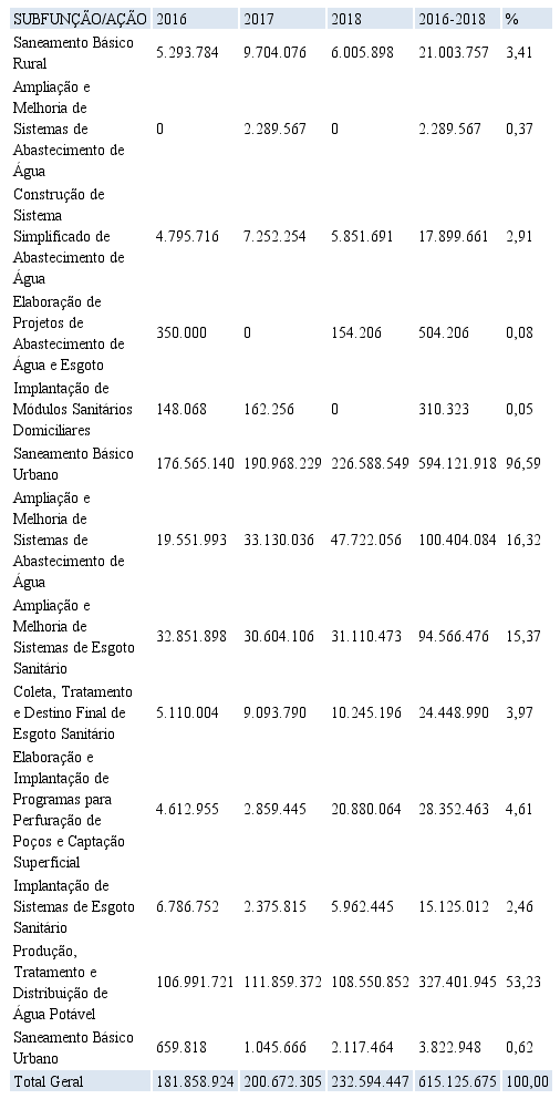 A análise dos dados do período de 2016 a 2018 demonstra novamente uma preponderância dos gastos com Saneamento Básico Urbano (96,6%), e uma leve recuperação dos gastos com Saneamento Básico Rural, 3,4% neste período ante 0,7% do período anterior. Números muito distantes dos 64% do período de 2009 a 2011. No período de 2016 a 2018 a principal ação foi novamente a Produção, Tratamento e Distribuição de Água Potável (53,2%), seguido da Ampliação e Melhoria de Sistemas de Abastecimento de Água (16,3%) e Ampliação e Melhoria de Sistemas de Esgoto Sanitário (15,4%).