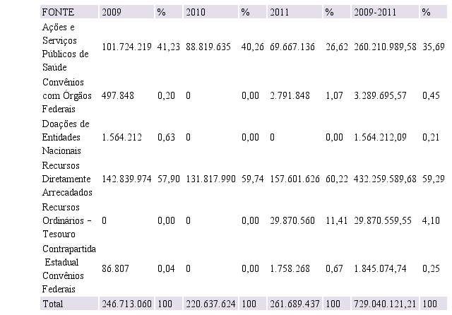 A análise da série histórica demonstra claramente que devido à redução de recursos originados da fonte “Ações e Serviços Públicos de Saúde”, a utilização de “Recursos Ordinários - Tesouro” passa a adquirir relevância. Esta fonte, que não contribuiu com o financiamento do saneamento nos anos de 2009 e 2010, atinge a marca de 11% em 2011, sendo a terceira principal fonte no período, com 4% dos recursos.