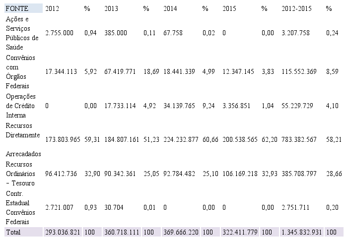 A análise do período seguinte de 2012 a 2015 demonstra uma completa perda de relevância da fonte “Ações e Serviços Públicos de Saúde” no financiamento do saneamento, passando a representar apenas 0,24% do volume investido. Nota-se, ainda, que os recursos originados dessa fonte, que chegaram a ultrapassar a marca de 100 milhões de reais em 2009, caíram de 2,7 milhões em 2012 para zero em 2015. Possivelmente, essa redução é um efeito da Lei Complementar nº 141, de 13 de janeiro de 2012, que dispõe sobre os valores mínimos a serem aplicados anualmente pela União, Estados, Distrito Federal e Municípios em ações e serviços públicos de saúde, e estabelece os critérios de rateio dos recursos de transferências e as normas de fiscalização, avaliação e controle das despesas com saúde nas três esferas de governo. Essa lei estabeleceu que as ações de saneamento básico, limpeza urbana e remoção de resíduos, e preservação e correção do meio ambiente não constituem despesas com ações e serviços públicos de saúde para fim de apuração da aplicação dos recursos (BRASIL, 2012). Assim, essa fonte de recursos deixou de contribuir com o financiamento das ações de saneamento ambiental.