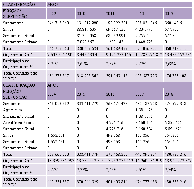 Nesse sentido, o entendimento do montante de recursos destinados para as políticas públicas passa primeiramente pela compreensão da classificação funcional da despesa, que é realizada por funções e subfunções no orçamento público, visando identificar a área em que ação governamental será realizada. Neste aspecto, este trabalho observou o disposto na Portaria nº 42/1999, do Ministério do Orçamento e Gestão, que discrimina a classificação da despesa por função. Deste modo, este artigo se ateve aos gastos classificados na função saneamento, e nas subfunções saneamento básico rural e saneamento básico urbano, mesmo que classificados em outras funções, visto que essas são subfunções inerentes à política de saneamento.