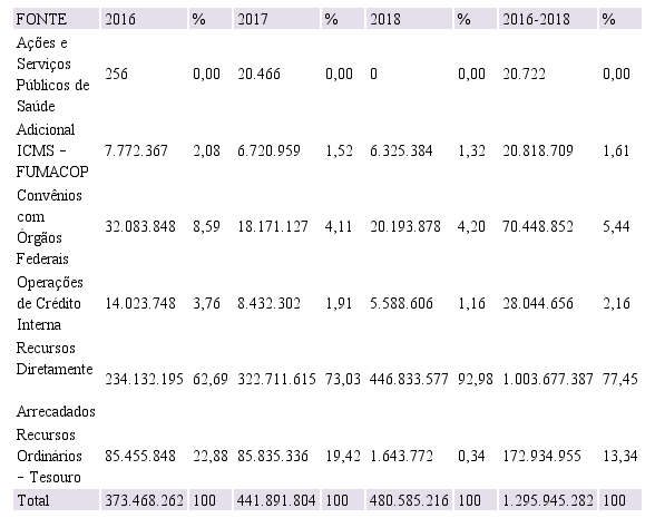 A análise do período de 2016 a 2018 demonstra uma trajetória crescente, constante e acentuada da importância dos “Recursos Diretamente Arrecadados” no conjunto das fontes de recursos do saneamento, passando de 62,7% em 2016 para mais de 92% em 2018. Os recursos dessa fonte praticamente dobraram neste período, indo de 234 milhões de reais em 2016 para mais de 446 milhões em 2018. Em sentido oposto, a importância dos “Recursos Ordinários – Tesouro” despencou de 22,9% em 2016 para 0,3% em 2018, em termos de valores a queda foi de 85 milhões para 1,6 milhões. Os recursos dessa fonte representaram apenas 13,3% do valor investido no triênio, enquanto no período anterior era de 28,7%. Os recursos advindos de “Convênios com Órgãos Federais” passaram de 8,6% no período anterior para 5,4%, figurando ainda como terceira fonte de recursos em termos de relevância.