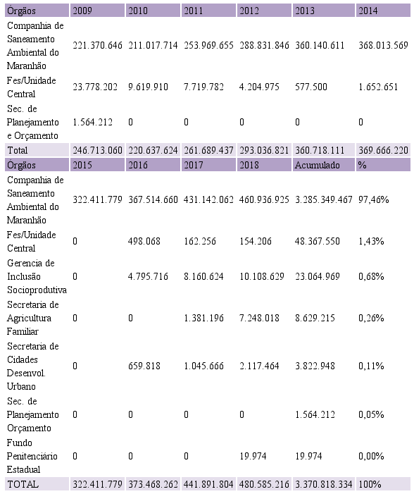 Em segundo plano, o Fundo Estadual de Saúde operado pela Secretaria de Estado da Saúde teve uma participação de apenas 1,43% dos gastos no período. Contudo, destaca-se que esta Secretaria chegou a gerir mais de 23,7 milhões de reais no ano de 2009, o que representou quase 10% dos recursos em saneamento, entretanto este valor foi reduzido paulatina e drasticamente a partir de 2010. Os dados evidenciam ainda uma diversificação dos órgãos que atuam na área de saneamento a partir do ano de 2016, com destaque para Gerência de Inclusão Socioprodutiva e Secretaria de Agricultura Familiar, contudo, com valores bem inferiores aos realizados pela CAEMA.