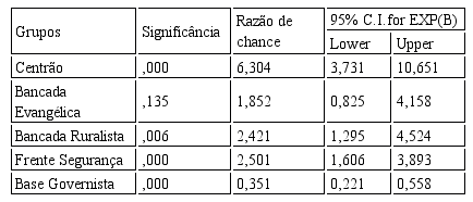 Nosso objetivo ao aplicar este modelo não foi no sentido de predizer algo, até porque todas as votações já aconteceram e todos os grupos analisados também foram consolidados. Com esta técnica, visamos demonstrar a influência das variáveis independentes como determinantes da aprovação da redução da maioridade penal na Câmara dos Deputados (variável dependente), a fim de revelar melhor a correlação de forças na Câmara que levou à aprovação da PEC 171/1993 e a razão de chance do voto pela aprovação em função do pertencimento dos grupos temáticos e políticos.