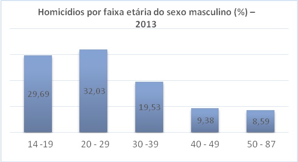 Na cidade de Juiz de Fora, podemos perceber que o perfil das vítimas masculinas confirma os dados apontados pela literatura. Dos 139 casos de homicídios registrados em 2013, 8,63% das vítimas são do sexo feminino. O restante, 91,36% dos casos (sexo masculino), distribuídos irregularmente no espaço, a faixa etária mais atingida foi a dos 20 aos 29 anos, com apenas 03 (três) casos a mais de homicídios do que a faixa etária dos 14 aos 19 anos (Gráfico I).