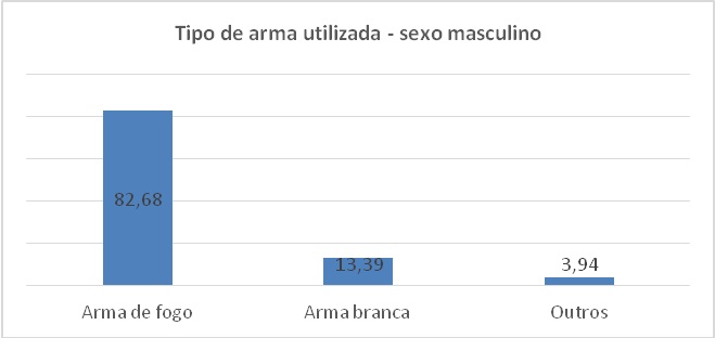 Dos 127 casos de homicídios praticados contra homens, 82,68% foram causados por disparo de arma de fogo, outros 13,39% por algum tipo de arma branca, o restante das agressões foi causada por espancamento, fogo e meios não informados.