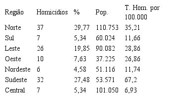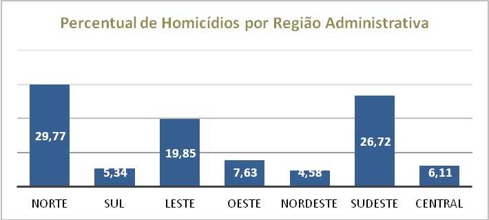 Dos 131 homicídios registrados na região administrativa, a que apresentou o menor percentual foi a Região Nordeste (4,62%), e a mais alta foi a Região Norte (28,46%), seguida de perto pela Região Sudeste (24,62%).